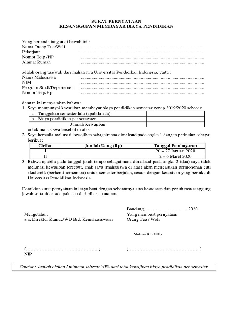 Dengan ini menyatakan bahwa , saya bersedia membayar biaya pendidikan yang telah. Jika menurut anda artikel ini bermanfaat, silakan membagikannya dengan kerabat dan kenalan anda. Surat pernyataan ini diperlukan oleh seseorang untuk menyatakan diri secara tertulis sehingga memiliki keterikatan akan suatu hal. Contohnya pada surat pernyataan cpns, yang harus diberikan secara. Yang bertanda tangan dibawah ini (materai 6000).