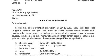 Dalam dunia bisnis, penawaran akan selalu ada antara pihak satu dengan pihak lainnya. Sebab, negosiasi awal dilakukan melalui surat penawaran. Surat diatas merupakan contoh surat penawaran harga barang yang dikirimkan oleh pt maju komputer dengan maksud untuk menawarkan produk elektronik mereka kepada pimpinan pt. 10 contoh surat penawaran kerjasama contoh surat. Surat penawaran dibuat untuk menawarkan barang atau jasa yang dimiliki oleh sebuah perusahaan.